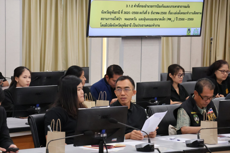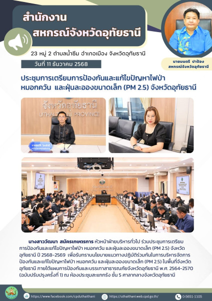 วันที่ 11 ธันวาคม 2568 นางสาววัฒนา สมัครเกษตรการ หัวหน้าฝ่ายบริหารทั่วไป ร่วมประชุมการเตรียมการป้องกันและแก้ไขปัญหาไฟป่า หมอกควัน และฝุ่นละอองขนาดเล็ก (PM 2.5) จังหวัดอุทัยธานี ปี 2568-2569 เพื่อรับทราบนโยบายแนวทางปฏิบัติร่วมกันในการบริหารจัดการป้องกันและแก้ไขปัญหาไฟป่า หมอกควัน และฝุ่นละอองขนาดเล็ก (PM 2.5) ในพื้นที่จังหวัดอุทัยธานี ภายใต้แผนการป้องกันและบรรเทาสาธารณภัยจังหวัดอุทัยธานี พ.ศ. 2564-2570 (ฉบับปรับปรุงครั้งที่ 1) ณ ห้องประชุมสะแกกรัง ชั้น 5 ศาลากลางจังหวัดอุทัยธานี