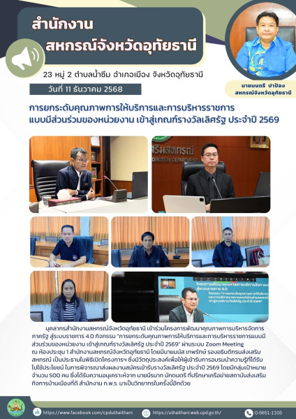 วันที่ 11 ธันวาคม 2568 บุคลากรสำนักงานสหกรณ์จังหวัดอุทัยธานี เข้าร่วมโครงการพัฒนาคุณภาพการบริหารจัดการภาครัฐ สู่ระบบราชการ 4.0 กิจกรรม "การยกระดับคุณภาพการให้บริการและการบริหารราชการแบบมีส่วนร่วมของหน่วยงาน เข้าสู่เกณฑ์รางวัลเลิศรัฐ ประจำปี 2569" ผ่านระบบ Zoom Meeting ณ ห้องประชุม 1 สำนักงานสหกรณ์จังหวัดอุทัยธานี โดยมีนายมนัส เทพรักษ์ รองอธิบดีกรมส่งเสริมสหกรณ์ เป็นประธานในพิธีเปิดโครงการฯ ซึ่งมีวัตถุประสงค์เพื่อให้ผู้เข้ารับการอบรมนำความรู้ที่ได้รับไปใช้ประโยชน์ ในการพิจารณาส่งผลงานสมัครเข้ารับรางวัลเลิศรัฐ ประจำปี 2569 โดยมีกลุ่มเป้าหมาย จำนวน 500 คน ซึ่งได้รับความอนุเคราะห์จาก นายนีรนาท นักดนตรี ที่ปรึกษาเครือข่ายสถาบันส่งเสริมกิจการบ้านเมืองที่ดี สำนักงาน ก.พ.ร. มาเป็นวิทยากรในครั้งนี้อีกด้วย