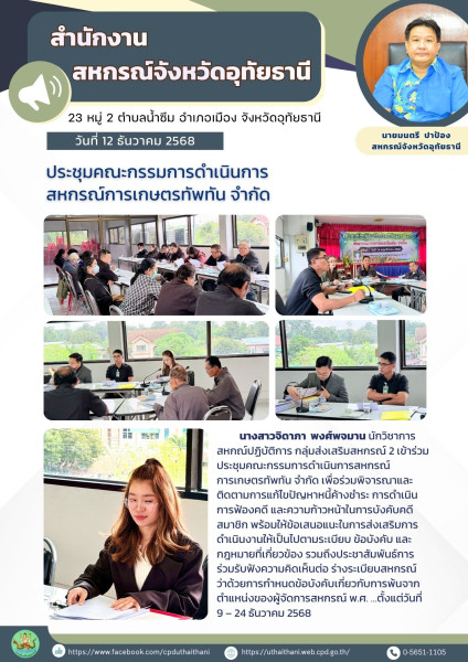 วันศุกร์ที่ 12 ธันวาคม 2568 นางสาวจิดาภา พงศ์พจมาน นักวิชาการสหกณ์ปฏิบัติการ กลุ่มส่งเสริมสหกรณ์ 2 เข้าร่วมประชุมคณะกรรมการดำเนินการสหกรณ์การเกษตรทัพทัน จำกัด เพื่อร่วมพิจารณาและติดตามการแก้ไขปัญหาหนี้ค้างชำระ การดำเนินการฟ้องคดี และความก้าวหน้าในการบังคับคดีสมาชิก พร้อมให้ข้อเสนอแนะในการส่งเสริมการดำเนินงานให้เป็นไปตามระเบียบ ข้อบังคับ และกฎหมายที่เกี่ยวข้อง รวมถึงประชาสัมพันธ์การร่วมรับฟังความคิดเห็นต่อ ร่างระเบียบสหกรณ์ ว่าด้วยการกำหนดข้อบังคับเกี่ยวกับการพ้นจากตำแหน่งของผู้จัดการสหกรณ์ พ.ศ. …ตั้งแต่วันที่ 9 – 24 ธันวาคม 2568