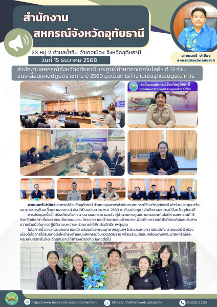สำนักงานสหกรณ์จังหวัดอุทัยธานี และศูนย์ถ่ายทอดเทคโนโลยีฯ ที่ 13 ร่วมขับเคลื่อนแผนปฏิบัติราชการ ปี 2569 มุ่งเน้นการทำงานเชิงรุกแบบบูรณาการ