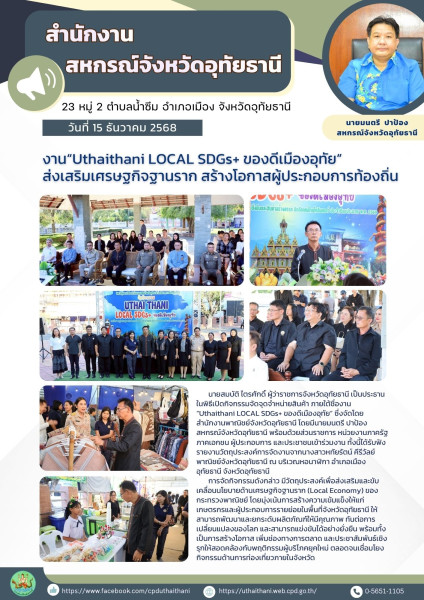 วันที่ 15 ธันวาคม 2568 นายสมบัติ ไตรศักดิ์ ผู้ว่าราชการจังหวัดอุทัยธานี เป็นประธานในพิธีเปิดกิจกรรมจัดจุดจำหน่ายสินค้า ภายใต้ชื่องาน “Uthaithani LOCAL SDGs+ ของดีเมืองอุทัย” ซึ่งจัดโดยสำนักงานพาณิชย์จังหวัดอุทัยธานี โดยมีนายมนตรี ปาป้อง สหกรณ์จังหวัดอุทัยธานี พร้อมด้วยส่วนราชการ หน่วยงานภาครัฐ ภาคเอกชน ผู้ประกอบการ และประชาชนเข้าร่วมงาน ทั้งนี้ได้รับฟังรายงานวัตถุประสงค์การจัดงานจากนางสาวหทัยรัตน์ คีรีวัลย์ พาณิชย์จังหวัดอุทัยธานี ณ บริเวณหอนาฬิกา อำเภอเมืองอุทัยธานี จังหวัดอุทัยธานี