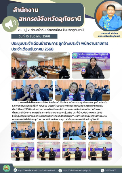 วันที่ 15 ธันวาคม 2568 เวลา 09.00 น. นายมนตรี ปาป้อง สหกรณ์จังหวัดอุทัยธานี เป็นประธานในการประชุมข้าราชการ ลูกจ้างประจำ และพนักงานราชการ ครั้งที่ 10/2568 พร้อมทั้งมอบประกาศเกียรติคุณนักส่งเสริมสหกรณ์ดีเด่น ประจำปี พ.ศ.2568 (ระดับหน่วยงาน) พร้อมทั้งแนะนำข้าราชการบรรจุใหม่ และพนักงานจ้างเหมา ตำแหน่ง นักวิชาการสหกรณ์ และการติดตามงานของกลุ่ม/ฝ่าย ประจำปีงบประมาณ พ.ศ. 2569 ให้เป็นไปตามแผนงานของกรมส่งเสริมสหกรณ์ และได้มอบแนวทางในการแก้ไขปัญหาการดำเนินงานของสหกรณ์เพื่อให้บรรลุเป้าหมายต่อไป ณ ห้องประชุม 1 สำนักงานสหกรณ์จังหวัดอุทัยธานี