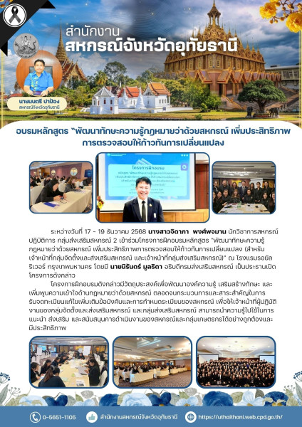 ระหว่างวันที่ 17 - 19 ธันวาคม 2568 นางสาวจิดาภา พงศ์พจมาน นักวิชาการสหกรณ์ปฏิบัติการ กลุ่มส่งเสริมสหกรณ์ 2 เข้าร่วมโครงการฝึกอบรมหลักสูตร “พัฒนาทักษะความรู้กฎหมายว่าด้วยสหกรณ์ เพิ่มประสิทธิภาพการตรวจสอบให้ก้าวทันการเปลี่ยนแปลง (สำหรับเจ้าหน้าที่กลุ่มจัดตั้งและส่งเสริมสหกรณ์ และเจ้าหน้าที่กลุ่มส่งเสริมสหกรณ์)” ณ โรงแรมรอยัล ริเวอร์ กรุงเทพมหานคร โดยมี นายนิรันดร์ มูลธิดา อธิบดีกรมส่งเสริมสหกรณ์ เป็นประธานเปิดโครงการดังกล่าว