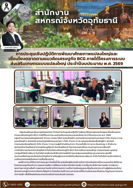 วันที่ 23 ธันวาคม 2568 กลุ่มส่งเสริมและพัฒนาธุรกิจสหกรณ์ ดำเนินการประชุมเชิงปฏิบัติการพัฒนาศักยภาพแปลงใหญ่และเชื่อมโยงตลาดตามแนวคิดเศรษฐกิจ BCG ภายใต้โครงการระบบส่งเสริมเกษตรแบบแปลงใหญ่ ประจำปีงบประมาณ พ.ศ. 2569 กลุ่มเป้าหมายแปลงใหญ่สหกรณ์ จำนวน 3 แปลง ได้แก่ แปลงใหญ่ข้าว สหกรณ์การเกษตรสว่างอารมณ์ จำกัด จำนวน 3 ราย แปลงใหญ่ข้าว สหกรณ์การเกษตรศุภนิมิตหนองยายดา จำกัด จำนวน 3 ราย และแปลงใหญ่เมล็ดพันธุ์ข้าว สหกรณ์การเกษตรเมืองอุทัยธานี จำกัด จำนวน 3 ราย รวมผู้เข้าร่วมโครงการฯ จำนวนทั้งสิ้น 9 ราย ณ ห้องประชุม สำนักงานสหกรณ์จังหวัดอุทัยธานี อำเภอเมืองอุทัยธานี จังหวัดอุทัยธานี วิทยากรบรรยายโดย นางสาวจุฑามาส กลิ่นเกล้า จากสำนักงานเกษตรจังหวัดอุทัยธานี ในหัวข้อแนวคิดเศรษฐกิจ BCG กับการพัฒนาแปลงใหญ่ นายอนรรฆพล บุญช่วย จากศูนย์วิจัยข้าวชัยนาท ในหัวข้อการเพิ่มประสิทธิภาพการผลิตข้าวของกลุ่มนาแปลงใหญ่ และนายจงกล พุฒศิริ ประธานเครือข่ายแปลงใหญ่จังหวัดอุทัยธานี พร้อมผู้แทนจากบริษัทโรงสีนครหลวงชัยนาท จำกัด ในหัวข้อการบริหารจัดการองค์กรเกษตรสมัยใหม่และการเชื่อมโยงตลาด