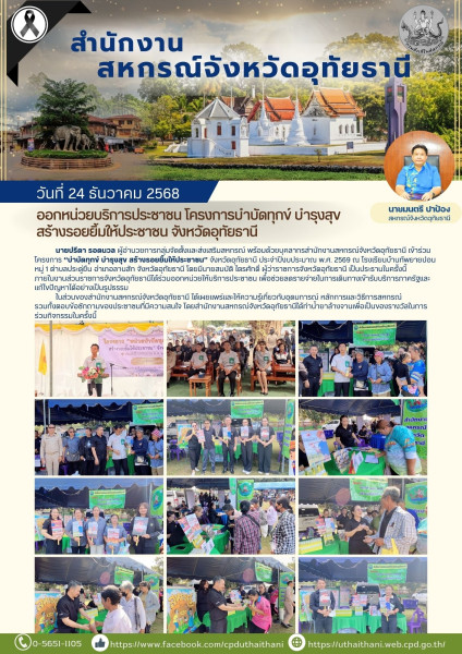วันที่ 24 ธันวาคม 2568 นายปรีดา รอดนวล ผู้อำนวยการกลุ่มจัดตั้งและส่งเสริมสหกรณ์ พร้อมด้วยบุคลากรสำนักงานสหกรณ์จังหวัดอุทัยธานี เข้าร่วมโครงการ “บำบัดทุกข์ บำรุงสุข สร้างรอยยิ้มให้ประชาชน” จังหวัดอุทัยธานี ประจำปีงบประมาณ พ.ศ. 2569 ณ โรงเรียนบ้านทัพยายปอน หมู่ 1 ตำบลประดู่ยืน อำเภอลานสัก จังหวัดอุทัยธานี โดยมีนายสมบัติ ไตรศักดิ์ ผู้ว่าราชการจังหวัดอุทัยธานี เป็นประธานในครั้งนี้