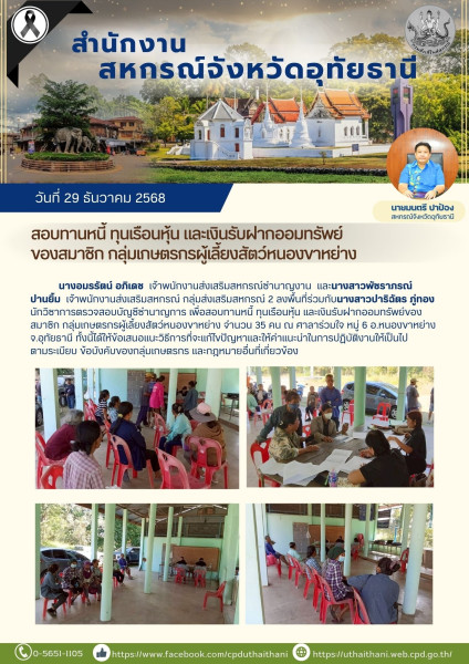 วันจันทร์ที่ 29 ธันวาคม 2568 นางอมรรัตน์ อภิเดช เจ้าพนักงานส่งเสริมสหกรณ์ชำนาญงาน และนางสาวพัชราภรณ์ ปานยิ้ม เจ้าพนักงานส่งเสริมสหกรณ์ กลุ่มส่งเสริมสหกรณ์ 2 ลงพื้นที่ร่วมกับนางสาวปาริฉัตร ภู่ทอง นักวิชาการตรวจสอบบัญชีชำนาญการ เพื่อสอบทานหนี้ ทุนเรือนหุ้น และเงินรับฝากออมทรัพย์ของสมาชิก กลุ่มเกษตรกรผู้เลี้ยงสัตว์หนองขาหย่าง จำนวน 35 คน ณ ศาลาร่วมใจ หมู่ 6 อ.หนองขาหย่าง จ. อุทัยธานี ทั้งนี้ได้ให้ข้อเสนอแนะวิธีการที่จะแก้ไขปัญหาและให้คำแนะนำในการปฏิบัติงานให้เป็นไปตามระเบียบ ข้อบังคับของกลุ่มเกษตรกร และกฎหมายอื่นที่เกี่ยวข้อง