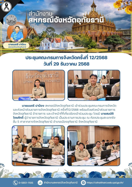 วันจันทร์ที่ 29 ธันวาคม 2568 นายมนตรี ปาป้อง สหกรณ์จังหวัดอุทัยธานี เข้าร่วมประชุมคณะกรมการจังหวัดและหัวหน้าส่วนราชการจังหวัดอุทัยธานี ครั้งที่12/2568 พร้อมด้วยหัวหน้าส่วนราชการจังหวัดอุทัยธานี ข้าราชการ และเจ้าหน้าที่ที่เกี่ยวข้องเข้าร่วมประชุม โดยมี นายสมบัติ ไตรศักดิ์ ผู้ว่าราชการจังหวัดอุทัยธานี เป็นประธานการประชุม ณ ห้องประชุมสะแกกรัง ชั้น 5 ศาลากลางจังหวัดอุทัยธานี อำเภอเมืองอุทัยธานี จังหวัดอุทัยธานี