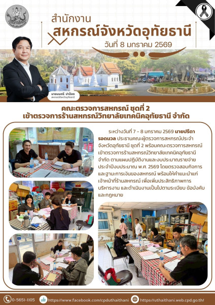 ระหว่างวันที่ 7 - 8 มกราคม 2569 นายปรีดา รอดนวล ประธานคณะผู้ตรวจการสหกรณ์ประจำจังหวัดอุทัยธานี ชุดที่ 2 พร้อมคณะตรวจการสหกรณ์ เข้าตรวจการร้านสหกรณ์วิทยาลัยเทคนิคอุทัยธานี จำกัด ตามแผนปฏิบัติงานและงบประมาณรายจ่ายประจำปีงบประมาณ พ.ศ. 2569 โดยตรวจสอบกิจการและฐานะการเงินของสหกรณ์ พร้อมให้คำแนะนำแก่เจ้าหน้าที่ร้านสหกรณ์ เพื่อเพิ่มประสิทธิภาพการบริหารงาน และดำเนินงานเป็นไปตามระเบียบ ข้อบังคับ และกฎหมาย