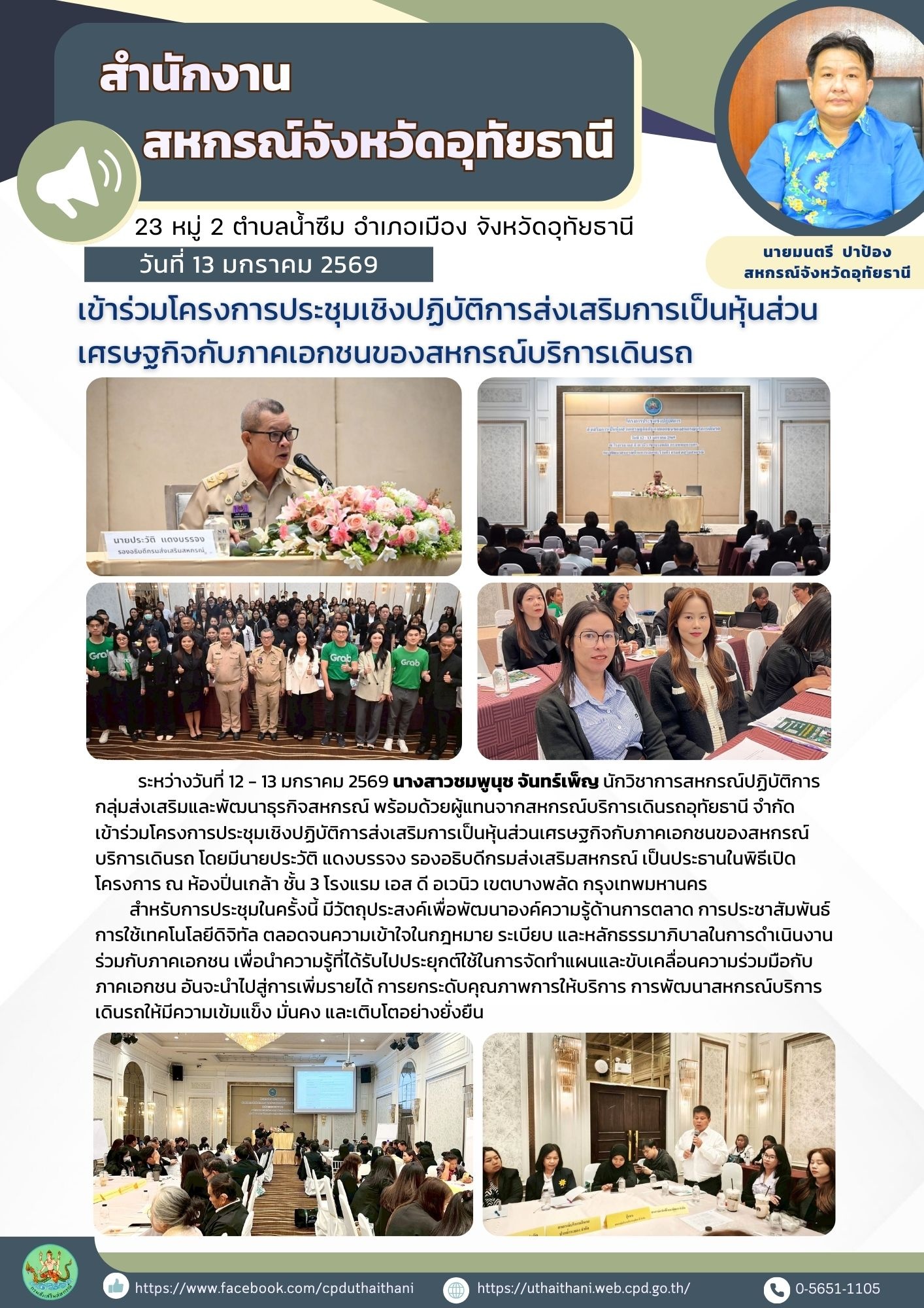 ระหว่างวันที่ 12 - 13 มกราคม 2569 นางสาวชมพูนุช จันทร์เพ็ญ นักวิชาการสหกรณ์ปฏิบัติการ กลุ่มส่งเสริมและพัฒนาธุรกิจสหกรณ์ พร้อมด้วยผู้แทนจากสหกรณ์บริการเดินรถอุทัยธานี จำกัด เข้าร่วมโครงการประชุมเชิงปฏิบัติการส่งเสริมการเป็นหุ้นส่วนเศรษฐกิจกับภาคเอกชนของสหกรณ์บริการเดินรถ โดยมีนายประวัติ แดงบรรจง รองอธิบดีกรมส่งเสริมสหกรณ์ เป็นประธานในพิธีเปิดโครงการ ณ ห้องปิ่นเกล้า ชั้น 3 โรงแรม เอส ดี อเวนิว เขตบางพลัด กรุงเทพมหานคร
