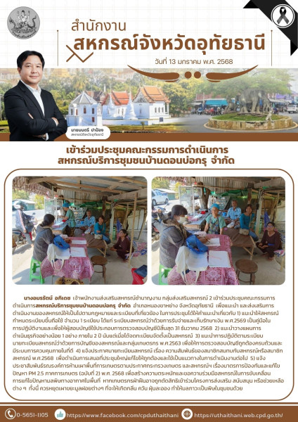 วันที่ 12 มกราคม 2569 เวลา 13.20 น. นางอมรรัตน์ อภิเดช เจ้าพนักงานส่งเสริมสหกรณ์ชำนาญงาน กลุ่มส่งเสริมสหกรณ์ 2 เข้าร่วมประชุมคณะกรรมการดำเนินการสหกรณ์บริการชุมชนบ้านดอนบ่อกรุ จำกัด อำเภอหนองขาหย่าง จังหวัดอุทัยธานี เพื่อแนะนำ และส่งเสริมการดำเนินงานของสหกรณ์ให้เป็นไปตามกฎหมายและระเบียบที่เกี่ยวข้อง ในการประชุม ได้ให้คำแนะนำเกี่ยวกับ 1) แนะนำให้สหกรณ์กำหนดระเบียบขึ้นถือใช้ จำนวน 1 ระเบียบ ได้แก่ ระเบียบสหกรณ์ว่าด้วยการรับจ่ายและเก็บรักษาเงิน พ.ศ.2569 เป็นคู่มือในการปฏิบัติงานและ เพื่อให้ผู้สอบบัญชีใช้ประกอบการตรวจสอบบัญชีปีสิ้นสุด 31 ธันวาคม 2568 2) แนะนำวางแผนการดำเนินธุรกิจอย่างน้อย 1 อย่าง ภายใน 2 ปี นับแต่เมื่อได้จดทะเบียนจัดตั้งเป็นสหกรณ์ 3) แนะนำการปฏิบัติตามระเบียบนายทะเบียนสหกรณ์ว่าด้วยการบัญชีของสหกรณ์และกลุ่มเกษตรกร พ.ศ.2563 เพื่อให้การตรวจสอบบัญชีถูกต้องครบถ้วนและมีระบบการควบคุมภายในที่ดี 4) แจ้งประกาศนายทะเบียนสหกรณ์ เรื่อง ความสัมพันธ์ของสมาชิกสมทบกับสหกรณ์หรือสมาชิกสหกรณ์ พ.ศ.2568 เพื่อดำเนินการเสนอที่ประชุมใหญ่แก้ไขให้ถูกต้องและใช้เป็นแนวทางในการดำเนินงานต่อไป 5) แจ้งประชาสัมพันธ์รณรงค์การห้ามเผาพื้นที่การเกษตรตามประกาศกระทรวงเกษตร และสหกรณ์ฯ เรื่องมาตรการป้องกันและแก้ไขปัญหา PM 2.5 ภาคการเกษตร (ฉบับที่ 2) พ.ศ. 2568 เพื่อสร้างความตระหนักและขอความร่วมมือสหกรณ์ในการขับเคลื่อนการแก้ไขปัญหามลพิษทางอากาศในพื้นที่ หากเกษตรกรฝ่าฝืนอาจถูกตัดสิทธิเข้าร่วมโครงการส่งเสริม สนับสนุน หรือช่วยเหลือต่าง ๆ ทั้งนี้ ควรหยุดเผาขยะมูลฝอยต่างๆ ที่จะให้เกิดกลิ่น ควัน ฝุ่นละออง ทำให้มลภาวะเป็นพิษในชุมชนด้วย