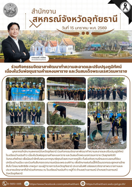 วันที่ 15 มกราคม 2569 บุคลากร และคณะเจ้าหน้าที่ของสำนักงานสหกรณ์จังหวัดอุทัยธานี ร่วมกิจกรรมจิตอาสาพัฒนาทำความสะอาดและปรับปรุงภูมิทัศน์โรงเรียน บ้านเนินก้าว เนื่องในวันพ่อขุนรามคำแหงมหาราช และวันสมเด็จพระนเรศวรมหาราช (วันยุทธหัตถี/วันกองทัพไทย) เพื่อน้อมรำลึกถึงพระมหากรุณาธิคุณด้วยความภาคภูมิใจ ทั้งยังเกิดความรักและหวงแหนที่ต้องปกป้องบ้านเมือง และร่วมกันสืบทอดเจตนารมณ์ของพระองค์ท่าน เพื่อรักษาแผ่นดินนี้ให้เป็นมรดกของลูกหลานไทยสืบไป โดยนายสิทธิชัย เทพภูษา รองผู้ว่าราชการจังหวัดอุทัยธานี ประธานในพิธี ปล่อยแถวจิตอาสาพระราชทานและประชาชนจิตอาสาที่เข้าร่วมกิจกรรม ณ โรงเรียนบ้านเนินก้าว หมู่ที่ 6 ตำบลสว่างอารมณ์ อำเภอสว่างอารมณ์ จังหวัดอุทัยธานี