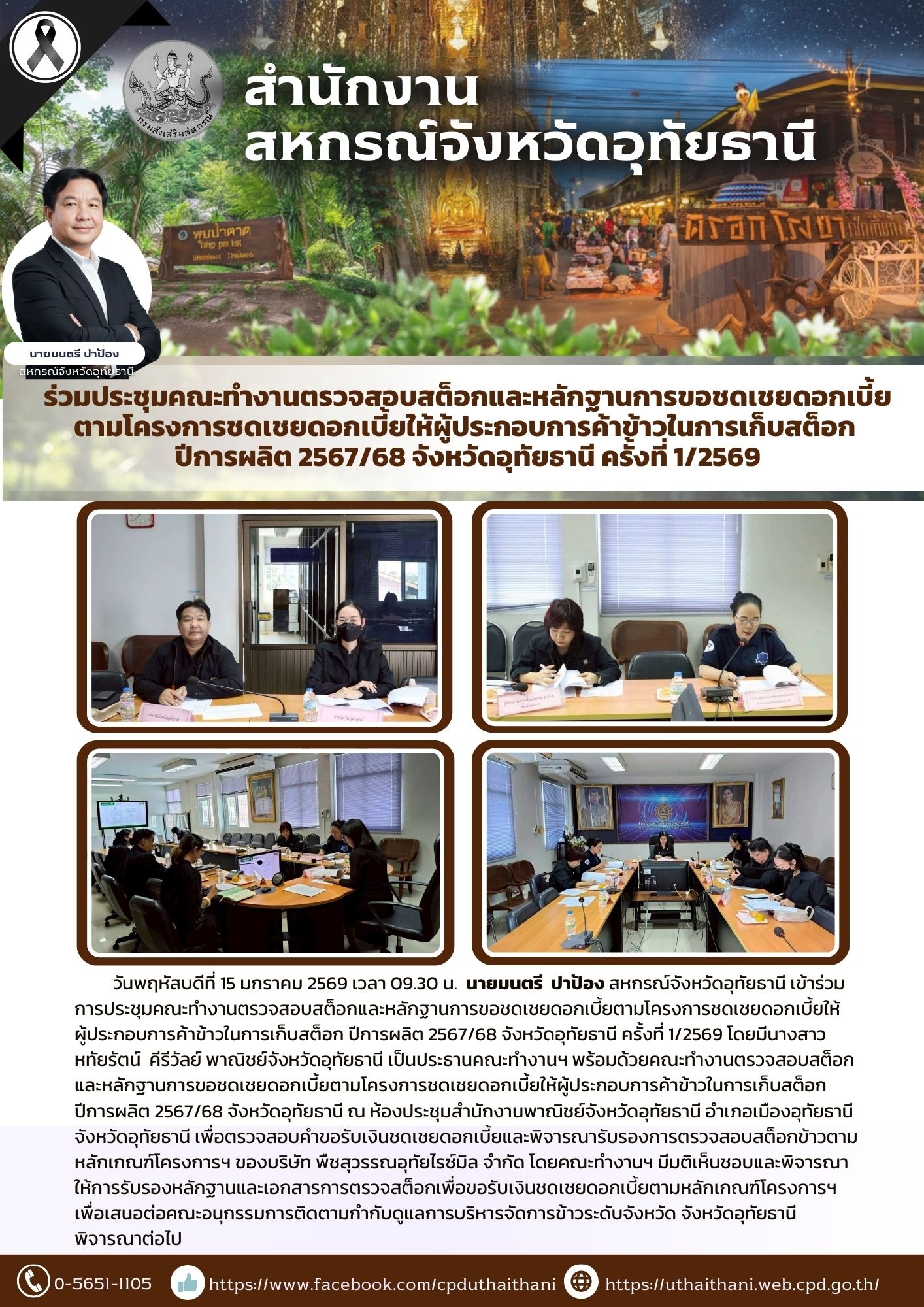 วันพฤหัสบดีที่ 15 มกราคม 2569 เวลา 09.30 น. นายมนตรี ปาป้อง สหกรณ์จังหวัดอุทัยธานี เข้าร่วมการประชุมคณะทำงานตรวจสอบสต็อกและหลักฐานการขอชดเชยดอกเบี้ยตามโครงการชดเชยดอกเบี้ยให้ผู้ประกอบการค้าข้าวในการเก็บสต็อก ปีการผลิต 2567/68 จังหวัดอุทัยธานี ครั้งที่ 1/2569 โดยมีนางสาวหทัยรัตน์ คีรีวัลย์ พาณิชย์จังหวัดอุทัยธานี เป็นประธานคณะทำงานฯ พร้อมด้วยคณะทำงานตรวจสอบสต็อกและหลักฐานการขอชดเชยดอกเบี้ยตามโครงการชดเชยดอกเบี้ยให้ผู้ประกอบการค้าข้าวในการเก็บสต็อก ปีการผลิต 2567/68 จังหวัดอุทัยธานี ณ ห้องประชุมสำนักงานพาณิชย์จังหวัดอุทัยธานี อำเภอเมืองอุทัยธานี จังหวัดอุทัยธานี เพื่อตรวจสอบคำขอรับเงินชดเชยดอกเบี้ยและพิจารณารับรองการตรวจสอบสต็อกข้าวตามหลักเกณฑ์โครงการฯ ของบริษัท พืชสุวรรณอุทัยไรซ์มิล จำกัด โดยคณะทำงานฯ มีมติเห็นชอบและพิจารณาให้การรับรองหลักฐานและเอกสารการตรวจสต็อกเพื่อขอรับเงินชดเชยดอกเบี้ยตามหลักเกณฑ์โครงการฯเพื่อเสนอต่อคณะอนุกรรมการติดตามกำกับดูแลการบริหารจัดการข้าวระดับจังหวัด จังหวัดอุทัยธานี พิจารณาต่อไป