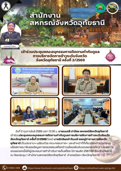 วันที่ 2 กุมภาพันธ์ 2569 เวลา 13.30 น. นายมนตรี ปาป้อง สหกรณ์จังหวัดอุทัยธานี เข้าร่วมประชุมคณะอนุกรรมการติดตามกำกับดูแลการบริหารจัดการข้าวระดับจังหวัด จังหวัดอุทัยธานี ครั้งที่ 2/2569 โดยมี นายอิทธิพงศ์ ตันมณี รองผู้ว่าราชการจังหวัดอุทัยธานี เป็นประธานฯ พร้อมด้วย คณะกรรมการฯ และเจ้าหน้าที่ที่เกี่ยวข้องเข้าร่วมประชุม เพื่อพิจารณารับรองข้อมูลการตรวจสอบสต็อกข้าวเพื่อขอรับเงินงดเชยดอกเบี้ย ตามโครงการชดเชยดอกเบี้ยให้ผู้ประกอบการค้าข้าวในการเก็บสต็อก ปีการผลิต 2567/68 จังหวัดอุทัยธานี ณ ห้องประชุม 1 สำนักงานสหกรณ์จังหวัดอุทัยธานี อำเภอเมืองฯ จังหวัดอุทัยธานี