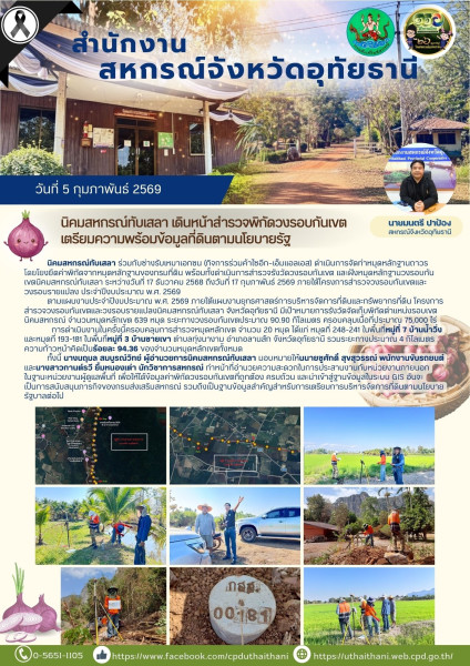 📚 ตามแผนงานประจำปีงบประมาณ พ.ศ. 2569 ภายใต้แผนงานยุทธศาสตร์การบริหารจัดการที่ดินและทรัพยากรที่ดิน โครงการสำรวจวงรอบกันเขตและวงรอบรายแปลง นิคมสหกรณ์ทับเสลา จังหวัดอุทัยธานี มีเป้าหมายการรังวัดจัดเก็บพิกัดตำแหน่งรอบเขตนิคมสหกรณ์ จำนวนหมุดหลักเขต 639 หมุด ระยะทางวงรอบกันเขตประมาณ 90.90 กิโลเมตร ครอบคลุมเนื้อที่ประมาณ 75,000 ไร่
