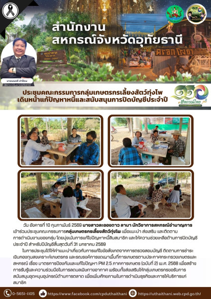วันอังคารที่ 10 กุมภาพันธ์ 2569 นางสาวละอองดาว ลานา นักวิชาการสหกรณ์ชำนาญการ เข้าร่วมประชุมคณะกรรมการกลุ่มเกษตรกรเลี้ยงสัตว์ทุ่งโพ เพื่อแนะนำ ส่งเสริม และติดตามการดำเนินงานของกลุ่ม โดยมุ่งเน้นการแก้ไขปัญหาหนี้สินสมาชิก และให้ความช่วยเหลือด้านการปิดบัญชีประจำปี สำหรับปีบัญชีสิ้นสุดวันที่ 31 มกราคม 2569