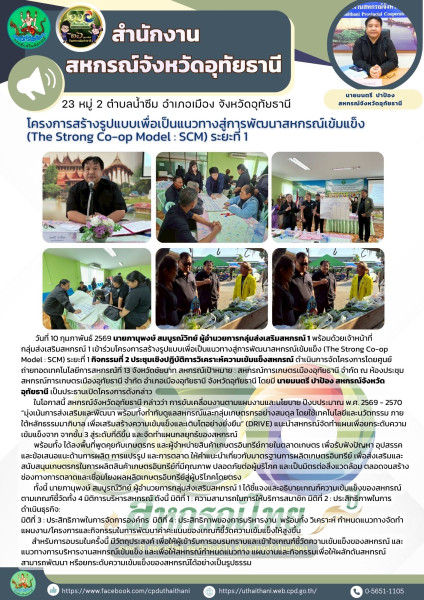 🗓️ วันที่ 10 กุมภาพันธ์ 2569 นายภานุพงษ์ สมบูรณ์วิทย์ ผู้อำนวยการกลุ่มส่งเสริมสหกรณ์ 1 พร้อมด้วยเจ้าหน้าที่กลุ่มส่งเสริมสหกรณ์ 1 เข้าร่วมโครงการสร้างรูปแบบเพื่อเป็นแนวทางสู่การพัฒนาสหกรณ์เข้มแข็ง (The Strong Co-op Model : SCM) ระยะที่ 1 กิจกรรมที่ 2 ประชุมเชิงปฏิบัติการวิเคราะห์ความเข้มแข็งสหกรณ์ ดำเนินการจัดโครงการโดยศูนย์ถ่ายทอดเทคโนโลยีการสหกรณ์ที่ 13 จังหวัดชัยนาท สหกรณ์เป้าหมาย : สหกรณ์การเกษตรเมืองอุทัยธานี จำกัด ณ ห้องประชุมสหกรณ์การเกษตรเมืองอุทัยธานี จำกัด อำเภอเมืองอุทัยธานี จังหวัดอุทัยธานี โดยมี นายมนตรี ปาป้อง สหกรณ์จังหวัดอุทัยธานี เป็นประธานเปิดโครงการดังกล่าว