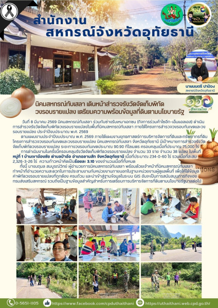 📆 วันที่ 8 มีนาคม 2569 นิคมสหกรณ์ทับเสลา ร่วมกับช่างรับเหมาเอกชน (กิจการร่วมค้าไซอีก–เอ็มแอลเอส) ดำเนินการสำรวจรังวัดจัดเก็บพิกัดวงรอบรายแปลงในพื้นที่นิคมสหกรณ์ทับเสลา ภายใต้โครงการสำรวจวงรอบกันเขตและวงรอบรายแปลง ประจำปีงบประมาณ พ.ศ. 2569