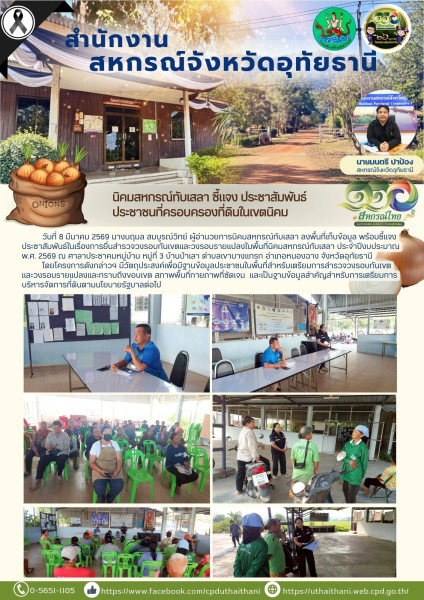 วันที่ 9 มีนาคม 2569 นางนฤมล สมบูรณ์วิทย์ ผู้อำนวยการนิคมสหกรณ์ทับเสลา ลงพื้นที่เก็บข้อมูล พร้อมชี้แจงประชาสัมพันธ์ในเรื่องการยื่นสำรวจวงรอบกันเขตและวงรอบรายแปลงในพื้นที่นิคมสหกรณ์ทับเสลา ประจำปีงบประมาณ พ.ศ. 2569 ณ ศาลาประชาคมหมู่บ้าน หมู่ที่ 3 บ้านป่าเลา ตำบลเขาบางแกรก อำเภอหนองฉาง จังหวัดอุทัยธานี
