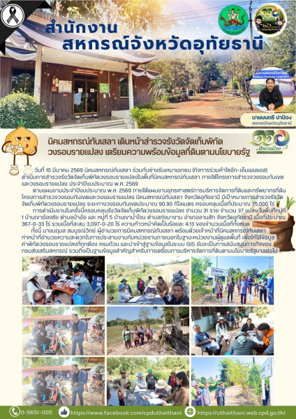 📚 ตามแผนงานประจำปีงบประมาณ พ.ศ. 2569 ภายใต้แผนงานยุทธศาสตร์การบริหารจัดการที่ดินและทรัพยากรที่ดิน โครงการสำรวจวงรอบกันเขตและวงรอบรายแปลง นิคมสหกรณ์ทับเสลา จังหวัดอุทัยธานี มีเป้าหมายการสำรวจรังวัดจัดเก็บพิกัดวงรอบรายแปลง ระยะทางวงรอบกันเขตประมาณ 90.90 กิโลเมตร ครอบคลุมเนื้อที่ประมาณ 75,000 ไร่
