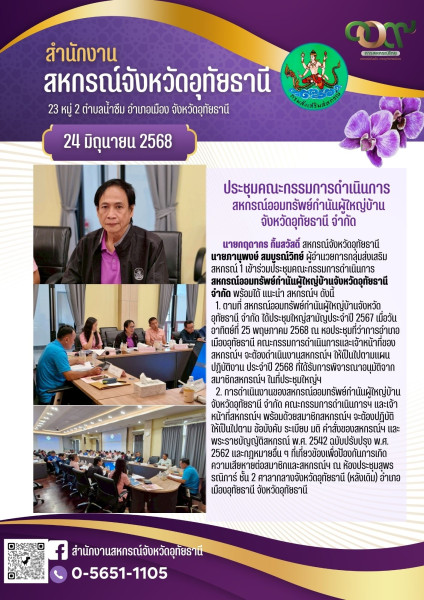 วันอังคารที่ 24 มิถุนายน 2568 นายกฤดากร กิ้มสวัสดิ์ สหกรณ์จังหวัดอุทัยธานี มอบหมายให้ นายภานุพงษ์ สมบูรณ์วิทย์ ผู้อำนวยการกลุ่มส่งเสริมสหกรณ์ 1 เข้าร่วมประชุมคณะกรรมการดำเนินการ สหกรณ์ออมทรัพย์กำนันผู้ใหญ่บ้านจังหวัดอุทัยธานี จำกัด พร้อมได้ แนะนำ สหกรณ์ฯ ดังนี้