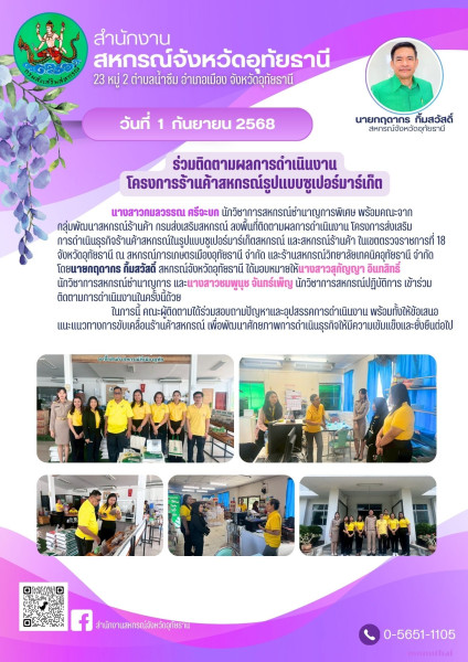 วันที่ 1 กันยายน 2568 นางสาวกมลวรรณ ศรีจะบก นักวิชาการสหกรณ์ชำนาญการพิเศษ พร้อมคณะจากกลุ่มพัฒนาสหกรณ์ร้านค้า กรมส่งเสริมสหกรณ์ ลงพื้นที่ติดตามผลการดำเนินงาน โครงการส่งเสริมการดำเนินธุรกิจร้านค้าสหกรณ์ในรูปแบบซูเปอร์มาร์เก็ตสหกรณ์ และสหกรณ์ร้านค้า ในเขตตรวจราชการที่ 18 จังหวัดอุทัยธานี ณ สหกรณ์การเกษตรเมืองอุทัยธานี จำกัด และร้านสหกรณ์วิทยาลัยเทคนิคอุทัยธานี จำกัด โดยนายกฤดากร กิ้มสวัสดิ์ สหกรณ์จังหวัดอุทัยธานี ได้มอบหมายให้นางสาวสุกัญญา อินทสิทธิ์ นักวิชาการสหกรณ์ชำนาญการ และนางสาวชมพูนุช จันทร์เพ็ญ นักวิชาการสหกรณ์ปฏิบัติการ เข้าร่วมติดตามการดำเนินงานในครั้งนี้ด้วย