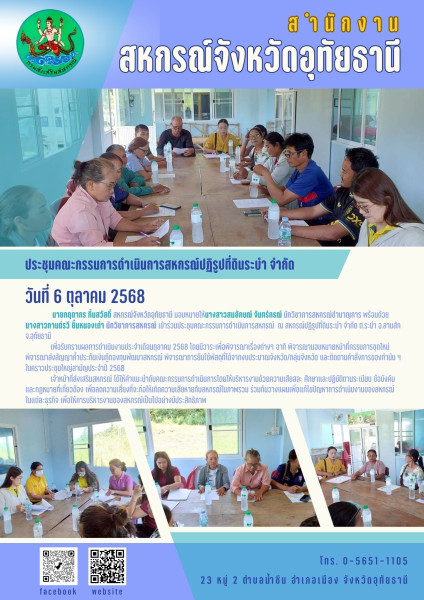 วันที่ 6 ตุลาคม 2568 นายกฤดากร กิ้มสวัสดิ์ สหกรณ์จังหวัดอุทัยธานี มอบหมายให้นางสาวสมลักษณ์ จันทร์กรณ์ นักวิชาการสหกรณ์ชำนาญการ พร้อมด้วยนางสาวกานต์รวี ยิ้มหนองเต่า นักวิชาการสหกรณ เข้าร่วมประชุมคณะกรรมการดำเนินการสหกรณ์ ณ สหกรณ์ปฎิรูปที่ดินระบำ จำกัด ต.ระบำ อ.ลานสัก จ.อุทัยธานี