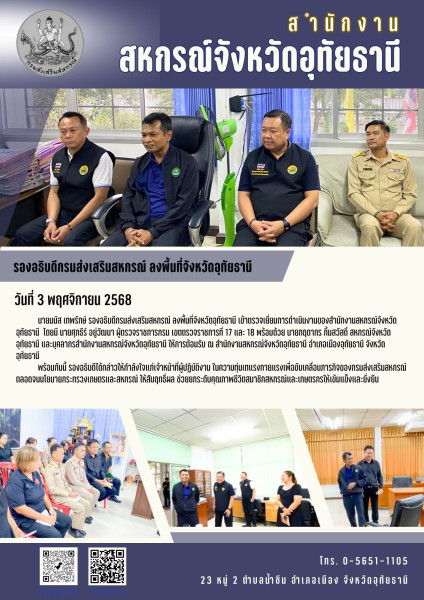 วันที่ 3 พฤศจิกายน 2568 นายมนัส เทพรักษ์ รองอธิบดีกรมส่งเสริมสหกรณ์ ลงพื้นที่จังหวัดอุทัยธานี เข้าตรวจเยี่ยมการดำเนินงานของสำนักงานสหกรณ์จังหวัดอุทัยธานี โดยมี นายศุภธีร์ อยู่วัฒนา ผู้ตรวจราชการกรม เขตตรวจราชการที่ 17 และ 18 พร้อมด้วย นายกฤดากร กิ้มสวัสดิ์ สหกรณ์จังหวัดอุทัยธานี และบุคลากรสำนักงานสหกรณ์จังหวัดอุทัยธานี ให้การต้อนรับ ณ สำนักงานสหกรณ์จังหวัดอุทัยธานี อำเภอเมืองอุทัยธานี จังหวัดอุทัยธานี