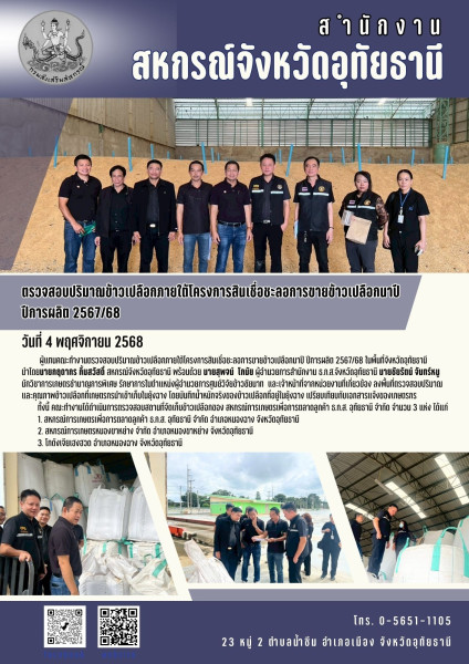 วันที่ 4 พฤศจิกายน 2568 ผู้แทนคณะทำงานตรวจสอบปริมาณข้าวเปลือกภายใต้โครงการสินเชื่อชะลอการขายข้าวเปลือกนาปี ปีการผลิต 2567/68 ในพื้นที่จังหวัดอุทัยธานี นำโดยนายกฤดากร กิ้มสวัสดิ์ สหกรณ์จังหวัดอุทัยธานี พร้อมด้วย นายสุพจน์ โกมัย ผู้อำนวยการสำนักงาน ธ.ก.ส.จังหวัดอุทัยธานี นายชัยรัตน์ จันทร์หนู นักวิชาการเกษตรชำนาญการพิเศษ รักษาการในตำแหน่งผู้อำนวยการศูนย์วิจัยข้าวชัยนาท และเจ้าหน้าที่จากหน่วยงานที่เกี่ยวข้อง ลงพื้นที่ตรวจสอบปริมาณและคุณภาพข้าวเปลือกที่เกษตรกรนำเข้าเก็บในยุ้งฉาง โดยบันทึกน้ำหนักจริงของข้าวเปลือกที่อยู่ในยุ้งฉาง เปรียบเทียบกับเอกสารแจ้งของเกษตรกร ทั้งนี้ คณะทำงานได้ดำเนินการตรวจสอบสถานที่จัดเก็บข้าวเปลือกของ สหกรณ์การเกษตรเพื่อการตลาดลูกค้า ธ.ก.ส. อุทัยธานี จำกัด จำนวน 3 แห่ง ได้แก่