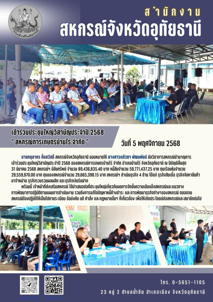 นายกฤดากร กิ้มสวัสดิ์ สหกรณ์จังหวัดอุทัยธานี มอบหมายให้ นางสาวแก้วตา พัฒนพันธ์ นักวิชาการสหกรณ์ชำนาญการ เข้าร่วมประชุมใหญ่วิสามัญประจำปี 2568 ของสหกรณ์การเกษตรบ้านไร่ จำกัด อำเภอบ้านไร่ จังหวัดอุทัยธานี