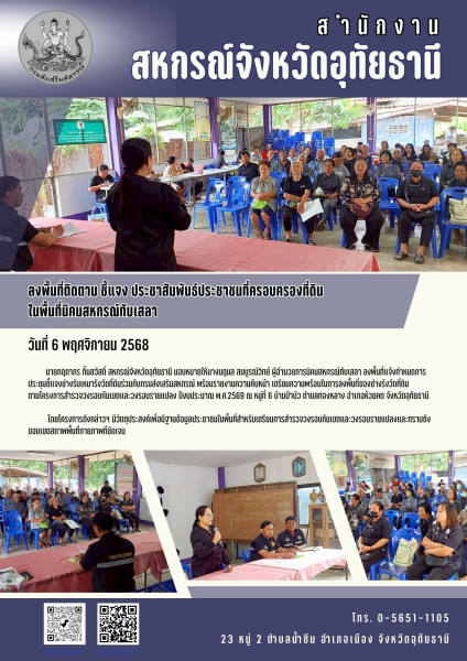 วันที่ 6 พฤศจิกายน 2568 นายกฤดากร กิ้มสวัสดิ์ สหกรณ์จังหวัดอุทัยธานี มอบหมายให้นางนฤมล สมบูรณ์วิทย์ ผู้อำนวยการนิคมสหกรณ์ทับเสลา ลงพื้นที่แจ้งกำหนดการประชุมชี้แจงช่างรับเหมารังวัดที่ดินร่วมกับกรมส่งเสริมสหกรณ์ พร้อมรายงานความคืบหน้า เตรียมความพร้อมในการลงพื้นที่ของช่างรังวัดที่ดิน ตามโครงการสำรวจวงรอบกันเขตและวงรอบรายแปลง ปีงบประมาณ พ.ศ.2569 ณ หมู่ที่ 6 บ้านป่าบัว ตำบลทองหลาง อำเภอห้วยคต จังหวัดอุทัยธานี