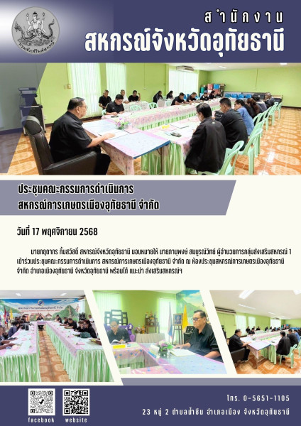 วันจันทร์ที่ 17 พฤศจิกายน 2568 นายกฤดากร กิ้มสวัสดิ์ สหกรณ์จังหวัดอุทัยธานี มอบหมายให้ นายภานุพงษ์ สมบูรณ์วิทย์ ผู้อำนวยการกลุ่มส่งเสริมสหกรณ์ 1 เข้าร่วมประชุมคณะกรรมการดำเนินการ สหกรณ์การเกษตรเมืองอุทัยธานี จำกัด ณ ห้องประชุมสหกรณ์การเกษตรเมืองอุทัยธานี จำกัด อำเภอเมืองอุทัยธานี จังหวัดอุทัยธานี พร้อมได้ แนะนำ ส่งเสริมสหกรณ์ฯ ดังนี้