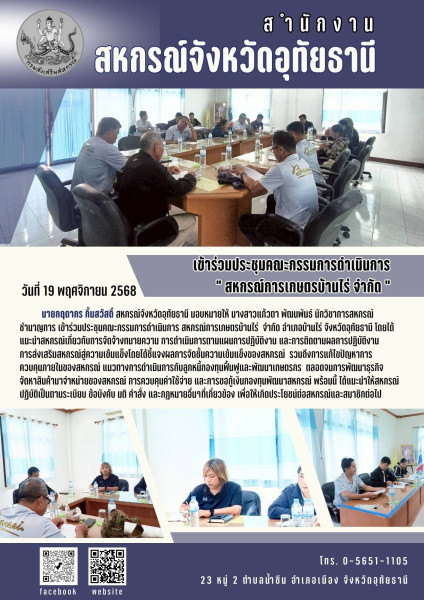 วันพุธที่ 19 พฤศจิกายน 2568 เวลา 10.00 น. นายกฤดากร กิ้มสวัสดิ์ สหกรณ์จังหวัดอุทัยธานี มอบหมายให้ นางสาวแก้วตา พัฒนพันธ์ นักวิชาการสหกรณ์ชำนาญการ เข้าร่วมประชุมคณะกรรมการดำเนินการ สหกรณ์การเกษตรบ้านไร่ จำกัด อำเภอบ้านไร่ จังหวัดอุทัยธานี โดยได้แนะนำสหกรณ์เกี่ยวกับการจัดจ้างทนายความ การดำเนินการตามแผนการปฎิบัติงาน และการติดตามผลการปฎิบัติงาน การส่งเสริมสหกรณ์สู่ความเข้มแข็งโดยได้ชี้แจงผลการจัดชั้นความเข้มแข็งของสหกรณ์ รวมถึงการแก้ไขปัญหาการควบคุมภายในของสหกรณ์ แนวทางการดำเนินการกับลูกหนี้กองทุนฟื้นฟูและพัฒนาเกษตรกร ตลอดจนการพัฒนาธุรกิจจัดหาสินค้ามาจำหน่ายของสหกรณ์ การควบคุมค่าใช้จ่าย และการขอกู้เงินกองทุนพัฒนาสหกรณ์ พร้อมนี้ ได้แนะนำให้สหกรณ์ปฏิบัติเป็นตามระเบียบ ข้อบังคับ มติ คำสั่ง และกฎหมายอื่นๆที่เกี่ยวข้อง เพื่อให้เกิดประโยชน์ต่อสหกรณ์และสมาชิกต่อไป