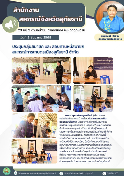 วันที่ 8 ธันวาคม 2568 นายภานุพงษ์ สมบูรณ์วิทย์ ผู้อำนวยการกลุ่มส่งเสริมสหกรณ์ 1 พร้อมด้วย นางสาวพนิดา แจ่มทรัพย์ไพศาล นักวิชาการสหกรณ์ปฏิบัติการ เข้าร่วมประชุมกลุ่มสมาชิก (กลุ่มที่ 47) และตรวจสอบยืนยันยอดภาระผูกพันธ์ที่สมาชิกมีอยู่กับสหกรณ์ (สอบทานหนี้) สหกรณ์การเกษตรเมืองอุทัยธานี จำกัด พร้อมได้ แนะนำ ส่งเสริม สมาชิกสหกรณ์ฯ ดังนี้ การดำเนินงานของสหกรณ์ฯ นั้น สมาชิกสหกรณ์ฯ จะต้องปฏิบัติตามระเบียบ ข้อบังคับ และมติที่ประชุมใหญ่ฯ สมาชิกต้องมีความสามัคคี ซื่อสัตย์ และเสียสละเพื่อประโยชน์ของส่วนรวม และจะต้องให้การสนับสนุน การมีส่วนร่วมในการดำเนินธุรกิจร่วมกับสหกรณ์ ว่าด้วย คุณค่าของสหกรณ์ อุดมการณ์สหกรณ์ หลักการสหกรณ์ และ วิธีการสหกรณ์ ณ ศาลาหมู่บ้าน ตำบลหลุมเข้า อำเภอหนองขาหย่าง จังหวัดอุทัยธานี