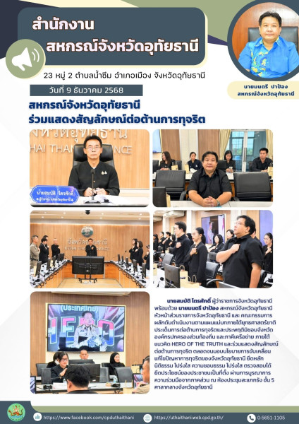 วันที่ 9 ธันวาคม 2568 นายสมบัติ ไตรศักดิ์ ผู้ว่าราชการจังหวัดอุทัยธานี พร้อมด้วย นายมนตรี ปาป้อง สหกรณ์จังหวัดอุทัยธานี หัวหน้าส่วนราชการจังหวัดอุทัยธานี และ คณะกรรมการผลักดันดำเนินงานตามแผนแม่บทภายใต้ยุทธศาสตร์ชาติประเด็นการต่อต้านการทุจริตและประพฤติมิชอบจังหวัด องค์กรปกครองส่วนท้องถิ่น และภาคีเครือข่าย ภายใต้แนวคิด HERO OF THE TRUTH และร่วมแสดงสัญลักษณ์ต่อต้านการทุจริต ตลอดจนมอบนโยบายการขับเคลื่อนแก้ไขปัญหาการทุจริตของจังหวัดอุทัยธานี ยึดหลักนิติธรรม โปร่งใส ความชอบธรรม โปร่งใส ตรวจสอบได้ ยึดประโยชน์ของประชาชนเป็นที่ตั้ง