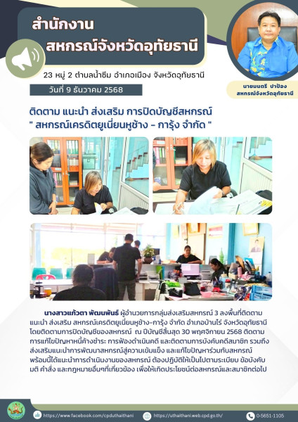 วันอังคารที่ 9 ธันวาคม 2568 เวลา 10.30 น. นางสาวแก้วตา พัฒนพันธ์ ผู้อำนวยการกลุ่มส่งเสริมสหกรณ์ 3 ลงพื้นที่ติดตาม แนะนำ ส่งเสริม สหกรณ์เครดิตยูเนี่ยนหูช้าง-การุ้ง จำกัด อำเภอบ้านไร่ จังหวัดอุทัยธานี โดยติดตามการปิดบัญชีของสหกรณ์ ณ ปีบัญชีสิ้นสุด 30 พฤศจิกายน 2568 ติดตามการแก้ไขปัญหาหนี้ค้างชำระ การฟ้องดำเนินคดี และติดตามการบังคับคดีสมาชิก รวมถึงส่งเสริมแนะนำการพัฒนาสหกรณ์สู่ความเข้มแข็ง และแก้ไขปัญหาร่วมกับสหกรณ์ พร้อมนี้ได้แนะนำการดำเนินงานของสหกรณ์ ต้องปฏิบัติให้เป็นไปตามระเบียบ ข้อบังคับ มติ คำสั่ง และกฎหมายอื่นๆที่เกี่ยวข้อง เพื่อให้เกิดประโยชน์ต่อสหกรณ์และสมาชิกต่อไป