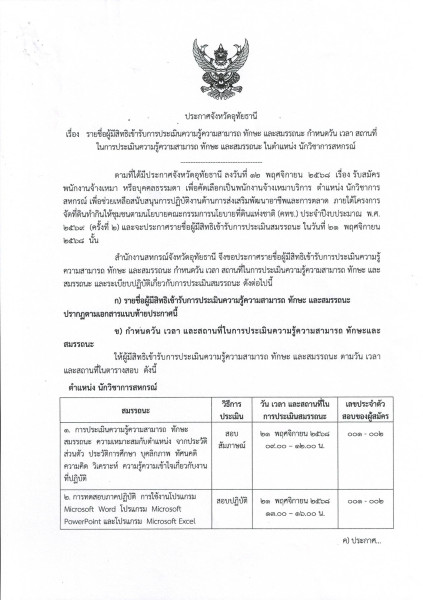 ประกาศจังหวัดอุทัยธานี เรื่อง รายชื่อผู้มีสิทธิเข้ารับการประเมินความรู้ความสามารถ ทักษะ และสมรรถนะ กำหนดวัน เวลา สถานที่ ในการประเมินความรู้ความรู้ความสามารถ ทักษะ และสมรรถนะ ในตำแหน่ง นักวิชาการสหกรณ์