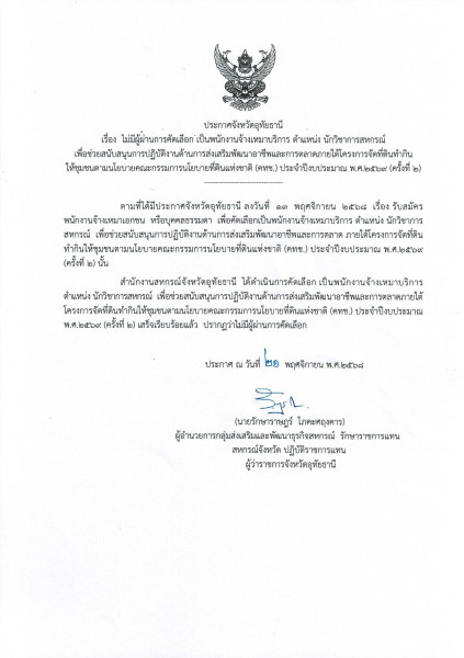 ประกาศจังหวัดอุทัยธานี เรื่อง ไม่มีผู้ผ่านการคัดเลือก เป็นพนักงานจ้างเหมาบริการ ตำแหน่ง นักวิชาการสหกรณ์ เพื่อช่วยสนับสนุนการปฏิบัติงานด้านการส่งเสริมพัฒนาอาชีพและการตลาดภายใต้โครงการจัดที่ดินทำกินให้ชุมชนตามนโยบายคณะกรรมการนโยบายที่ดินแห่งชาติ (คทช.) ประจำปีงบประมาณ 2569 (ครั้งที่ 2)